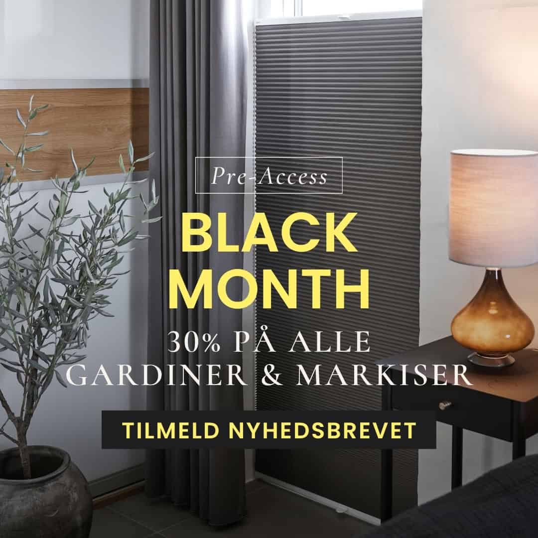 Tilmeld dig SEGAs nyhedsbrev, og få adgang til Black Month allerede nu. Black Month er din chance for at få årets stærkeste rabat, hvor du sparer 30% på alle gardiner og markiser.