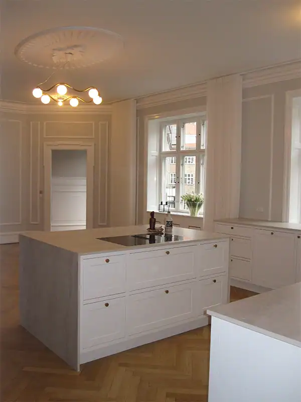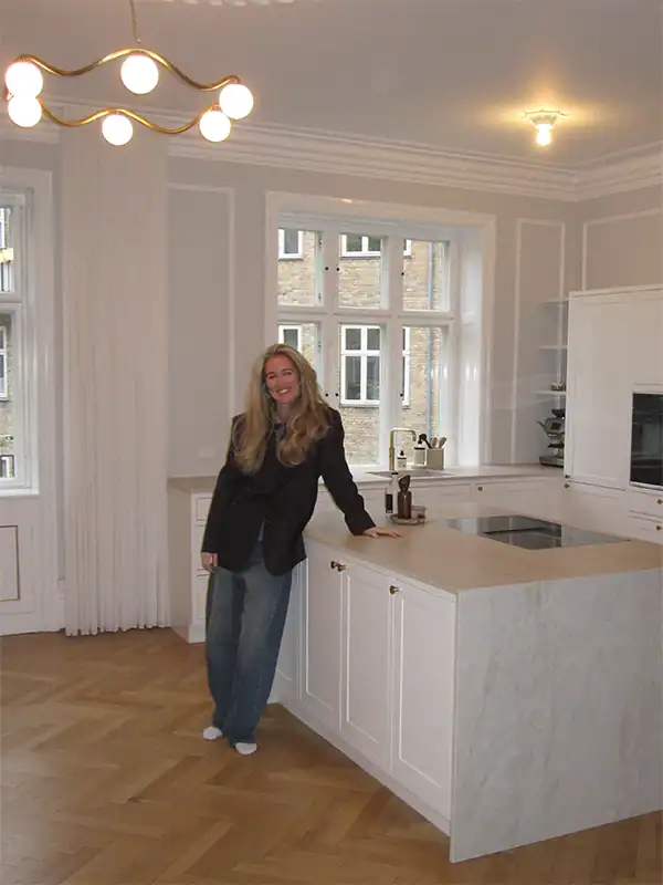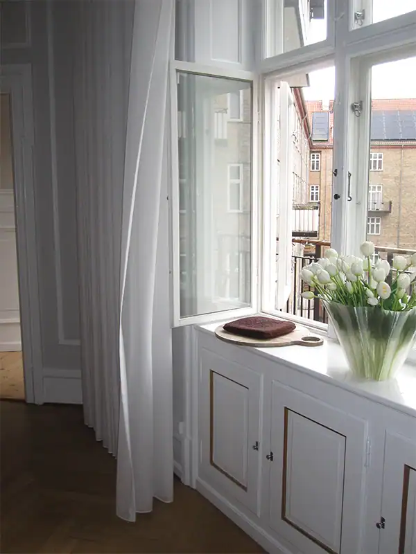Da køkkenet blev flyttet ind i spisestuen, blev gardinerne et naturligt omdrejningspunkt for indretningen. “Vi havde de smukke, lyse og luftige gardiner hængende i forvejen, så jeg vidste præcis, hvilket udtryk jeg gik efter i køkkenet, så rummene stadig hænger sammen,” fortæller Cecilie.