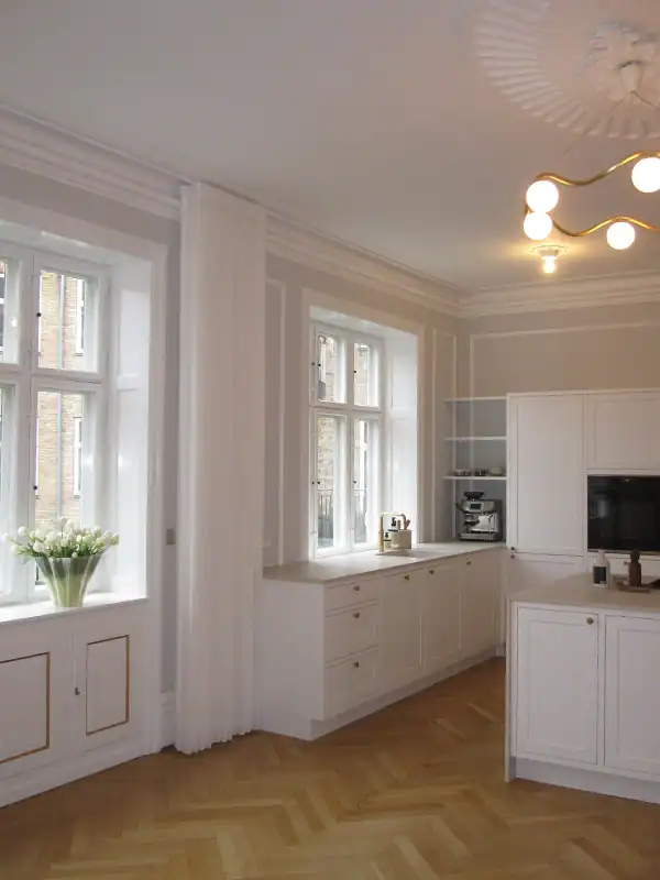 Gardinerne indrammer elegant det store vindue, mens køkkenets linjer understøtter helheden og skaber en rolig, sammenhængende helhed. “Jeg elsker, hvor smukt det rum er blevet.”