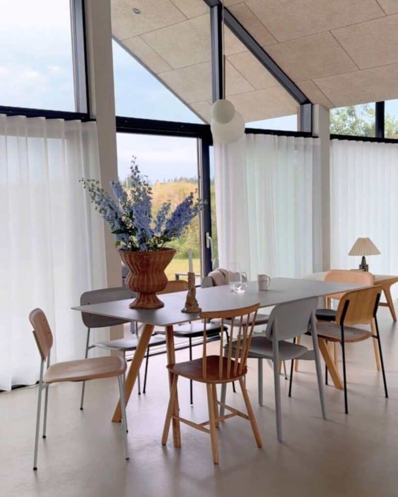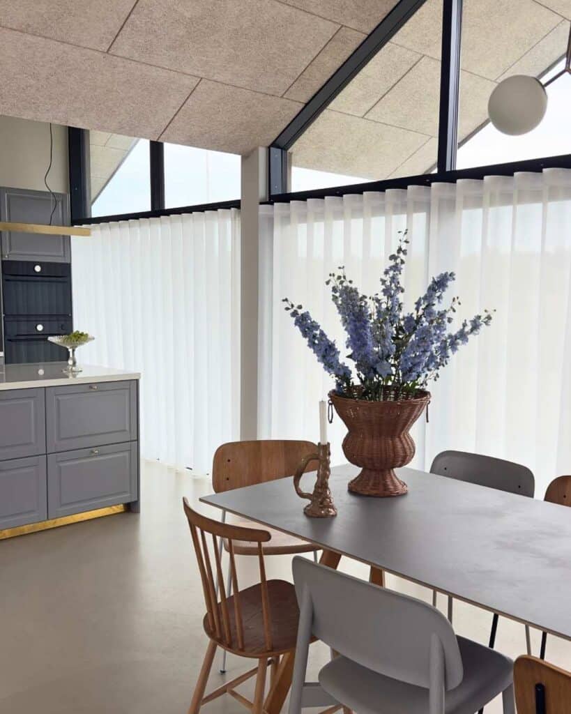 Samtidig skaber de transparente tekstiler en lethed og flow i rummet, særligt når dørene står åbne, og vinden sætter gardinerne i bevægelse.